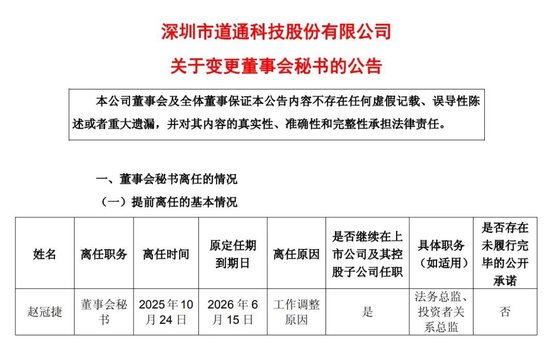 2025年10月25日,市值超250亿元的道通科技(688208)发布公告,宣布变更董事会秘书,因“工作调整原因”,赵冠捷不再担任董事会秘书职务,决定聘任李律为董事会秘书。公告中甚至都没有提及“辞职”字眼。