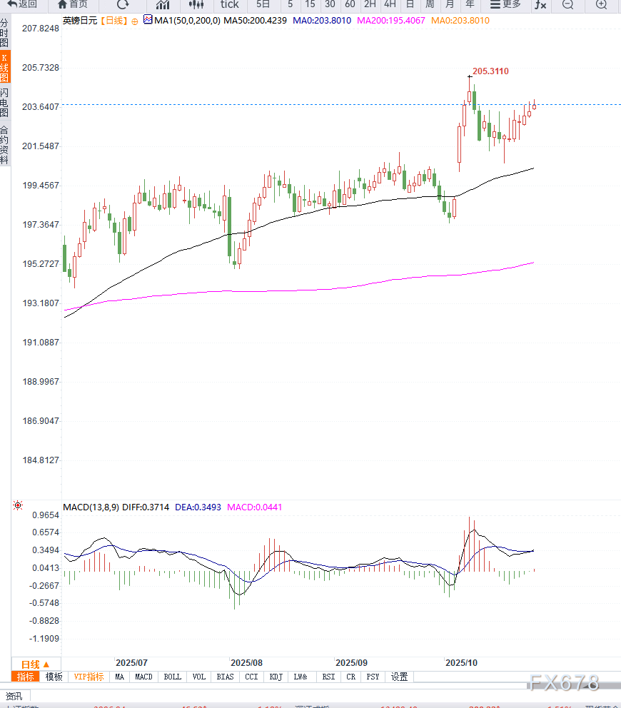 日线图形上来看豪极资本,GBP/JPY维持强势结构。若稳定在204.00上方,后市有望指向205.33(15个月高点),进一步突破或将打开通向208.11的空间;
