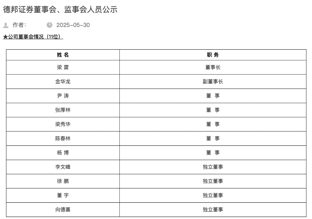 根据德邦证券最新公布的董事会名单(下图),德邦证券的董事长由梁雷出任,金华龙任职副董事长;此外董事还包括尹涛、张厚林、梁秀华、陈春林、杨博;独立董事则为李文峰、徐鹏、董宇、向德喜。